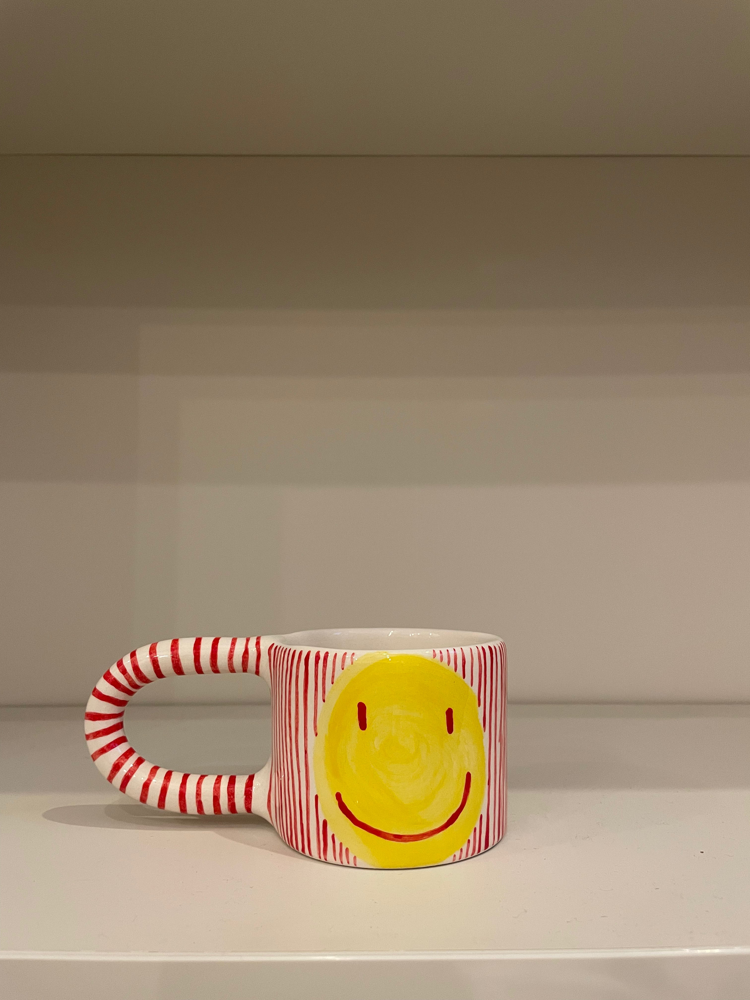 - Each mug is unique with hand-applied red smiley face glaze