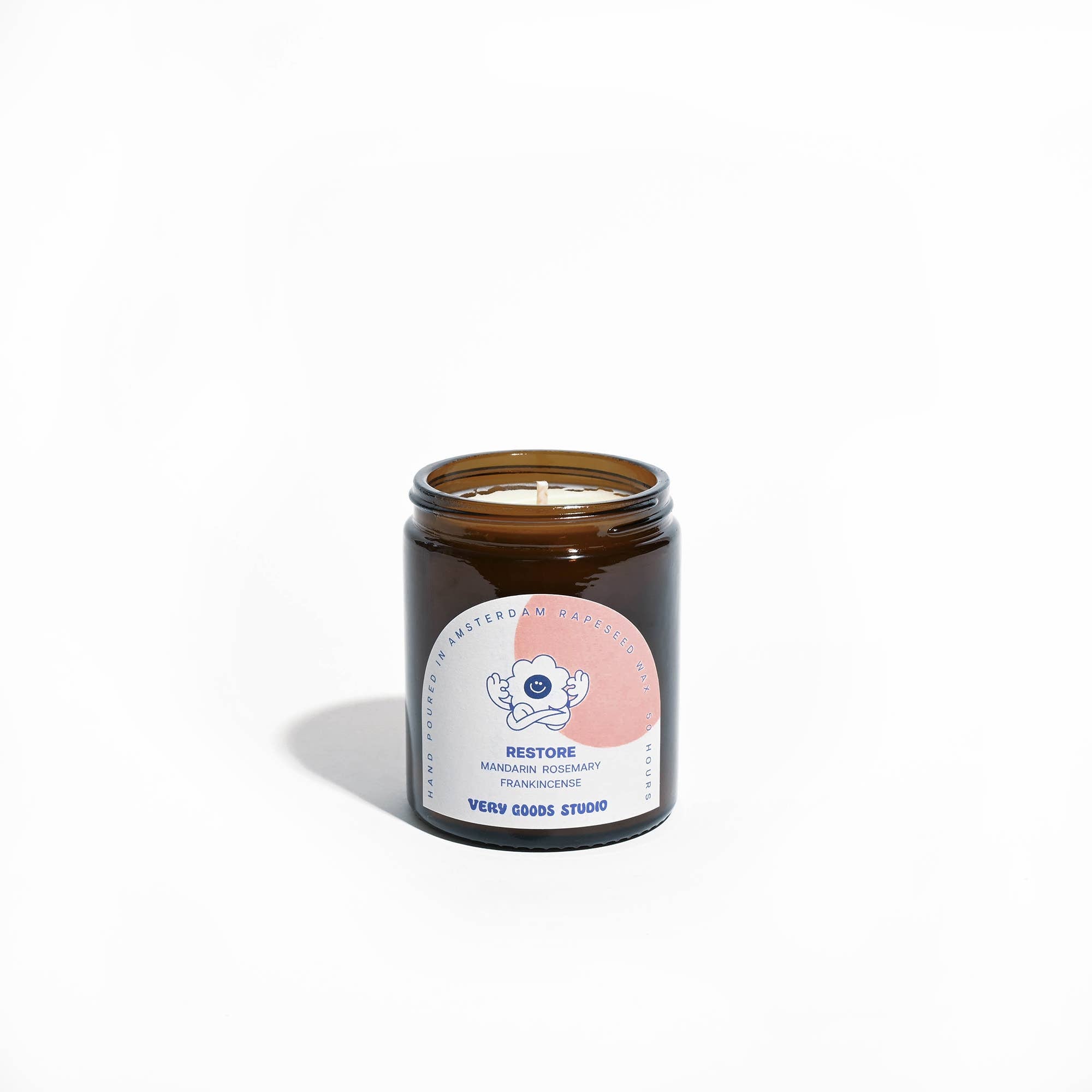 Scented Candle, Rapeseed Wax, cotton wick, amber glass. Handmade in Amsterdam. This scent is designed to clear your mind and uplift your mood. With its refreshing and energizing notes of green mandarin, herbaceous and cleansing rosemary, stress reducing frankincense and sweet/floral neroli, Restore will bring refreshment to your everyday lifestyle. Top: Frankincense, Mandarin Heart: Rosemary Base: Cedarwood